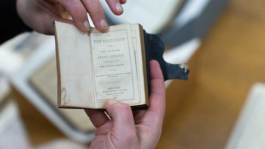 Olga Tsapina holds a small edition of the New Testament that Zachariah Shugart carried around in his pocket. Photograph by Aric Allen.