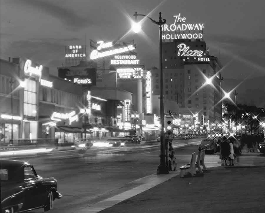 Vine Street at Sunset Boulevard, at Night, July 27, 1948. Photograph by Bob Plunkett. Ernest Marquez Collection. The Huntington Library, Art Museum, and Botanical Gardens.