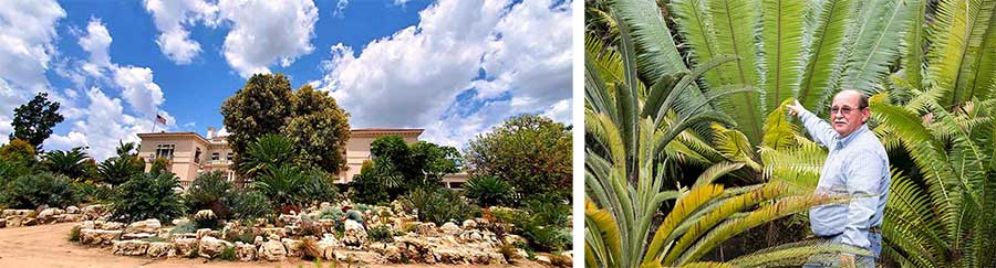 Left: Lead project gardener Gary Roberson works in The Huntington’s new hillside cycad garden, a dramatic showcase for thousands of plants donated by the late Loran and Eva Whitelock. Photo by Scott Berger. Right: Jim Folsom, in 2014, standing among several species of Dioon cycads in the garden of Loran Whitelock (1930–2014), author of The Cycads, the standard guide to the plants. Photograph by Kate Lain.