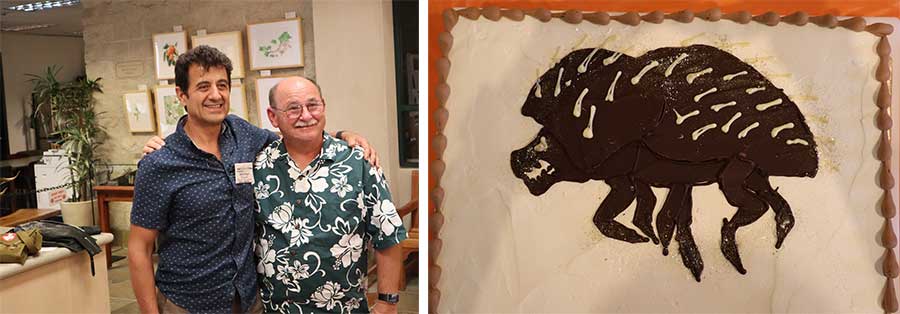 In 2012, while working at the University of California, Riverside, plant pathologist Akif Eskalen discovered that the invasive polyphagous shot hole borer beetle was destroying trees in Long Beach, California. Wanting to know how many different species of trees in the area might be at risk, he approached Jim Folsom about conducting a survey of the 3,000 different kinds of trees on The Huntington’s grounds. Folsom let Eskalen and his graduate student set up a small research lab. Left: Akif Eskalen (left), now at the University of California, Davis, and Jim Folsom at a party for Eskalen at The Huntington. Right: Cake decorated with a depiction of a polyphagous shot hole borer beetle. The Huntington Library, Art Museum, and Botanical Gardens.