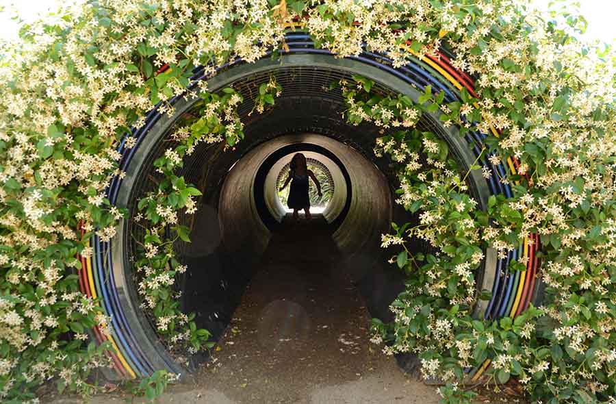 A child explores a tunnel filled with prism-scattered light in the Helen and Peter Bing Children’s Garden. The Huntington Library, Art Museum, and Botanical Gardens.