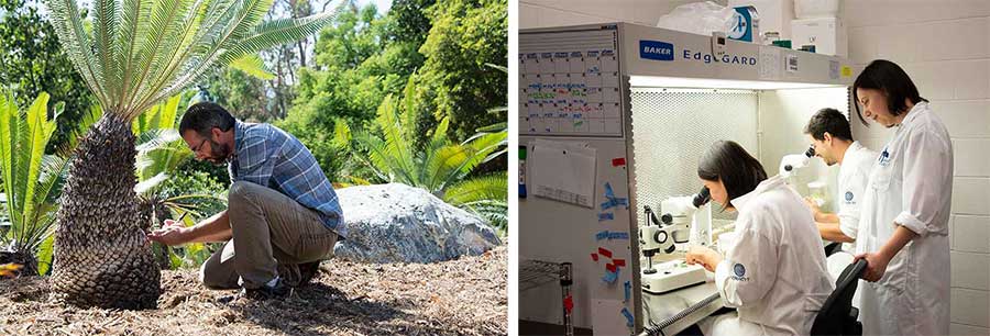 Jim Folsom has created an impressive research program, recruiting botanists to work on such topics as the evolution of cycads and the use of cryopreservation techniques to preserve plant diversity. Left: Brian Dorsey, research botanist, kneels before a Dioon merolae that came to The Huntington from the collection of Loran Whitelock. Photograph by Kate Lain. Right: Huntington Cryopreservation Research Botanist Raquel Folgado supervises as Lourdes Delgado and Felipe de Jesús Romo Paz—graduate students from Guadalajara, Mexico—prepare plant tissue for cryopreservation. Photograph by Deborah Miller.