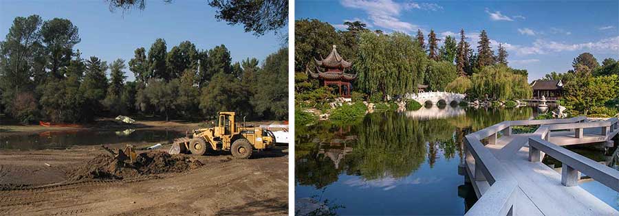 Left: Site of the Chinese Garden lake in 2002. Right: View of the Lake of Reflected Fragrance in 2018, showing some of the original features of the Chinese Garden—the Garden of Flowing Fragrance—that opened in 2008 (left to right): the Pavilion of the Three Friends, the Jade Ribbon Bridge, and the Hall of the Jade Camellia. In the foreground is the Bridge of the Joy of Fish. Photograph by Martha Benedict.