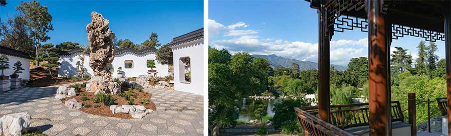 Two new features of the Chinese Garden in 2020. Left: The Cloudy Forest Court 雲林院, one of the architectural features within the Verdant Microcosm 翠玲瓏, the Chinese Garden’s new penjing complex. Photograph by Jamie Pham. Right: View from the Stargazing Tower 望星樓, situated on the highest point in the garden. The name pays homage to the nearby Mount Wilson Observatory—visible from the tower—and to the work of astronomer Edwin Hubble, whose papers are part of the The Huntington’s holdings in the history of science. Photograph by Aric Allen.