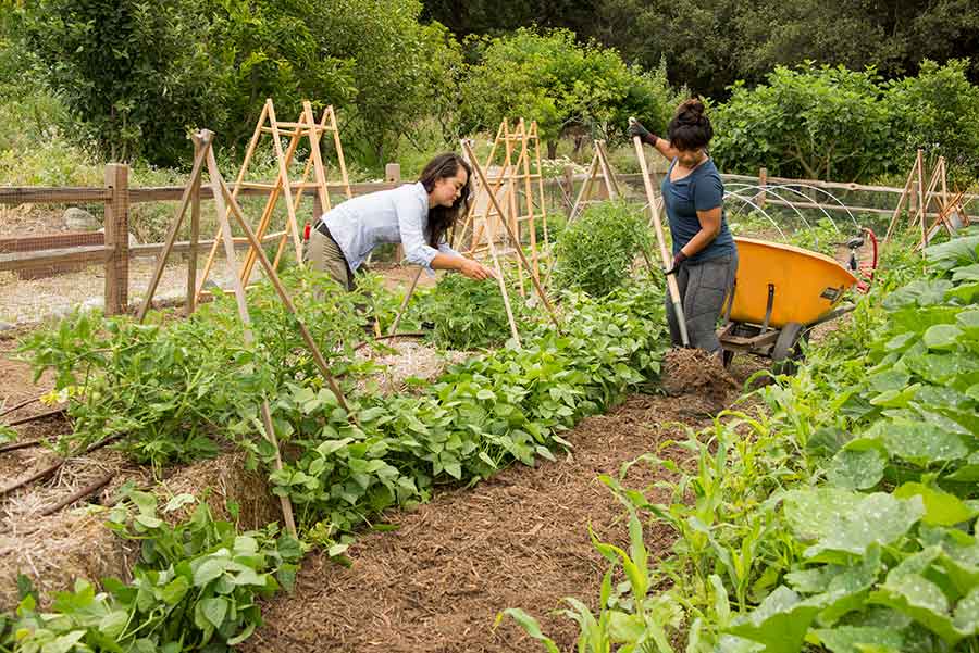 At The Huntingon’s Ranch Garden in 2017, Kelly Fernandez (left), head gardener of the Herb and Shakespeare gardens, built a framework to support vegetables growing in straw bales, while Emma Ho’o—a plant science major from California State Polytechnic University, Pomona, at the time—spread mulch between the rows. The Trustees of The Huntington recently passed a resolution to rename the Ranch the James P. Folsom Experimental Ranch Garden. Photograph by Kate Lain.