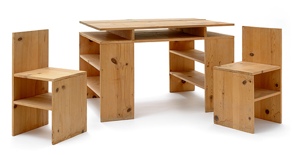 Unable to find furniture locally that suited his architecture, he decided to make his own out of pine, including the newly acquired chairs and desk, which were later put into commercial production in a variety of fine woods. Their design relates to the formal logic of Judd’s famous box sculptures, set at perpendicular angles to create the elements of back, seat, and legs.