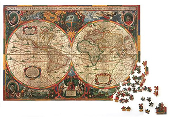 Create the world! This 1,000-piece interlocking jigsaw puzzle is a unique gift featuring stunning color reproduction, unusual imagery, and sturdy construction to delight cartography-loving Dads everywhere. This popular baroque-style map from The Huntington's collections includes depictions of the four elements —"earth, air, fire, and water"— and portraits of Julius Caesar and cartographers Claudius Ptolemy, Gerard Mercator, and Jodocus Hondius, Sr. Created exclusively for The Huntington. 1000 pieces / 29 x 20".