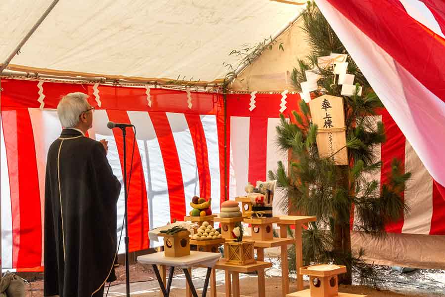 The traditional Shinto ceremony was performed by members of Shumei America, a faith-based group that promotes living in harmony with nature. Symbolic offerings were placed on an altar as humble gifts to the spirits. Salt was scattered around the framework of the house in ritual purification. Pieces of pine bough, symbolizing the regeneration of nature, were placed on the altar. And an ancient chant called the Amatsunorito, or Heavenly Prayer, invoked divine blessings. Ritualized handclaps, in sets of three, honored the three realms: the spiritual world, ancestors, and earthly existence.