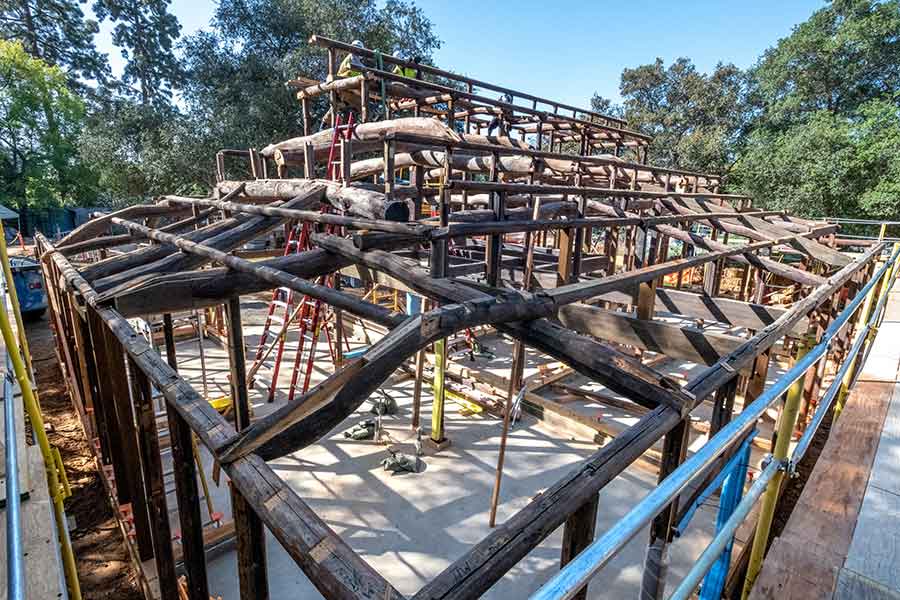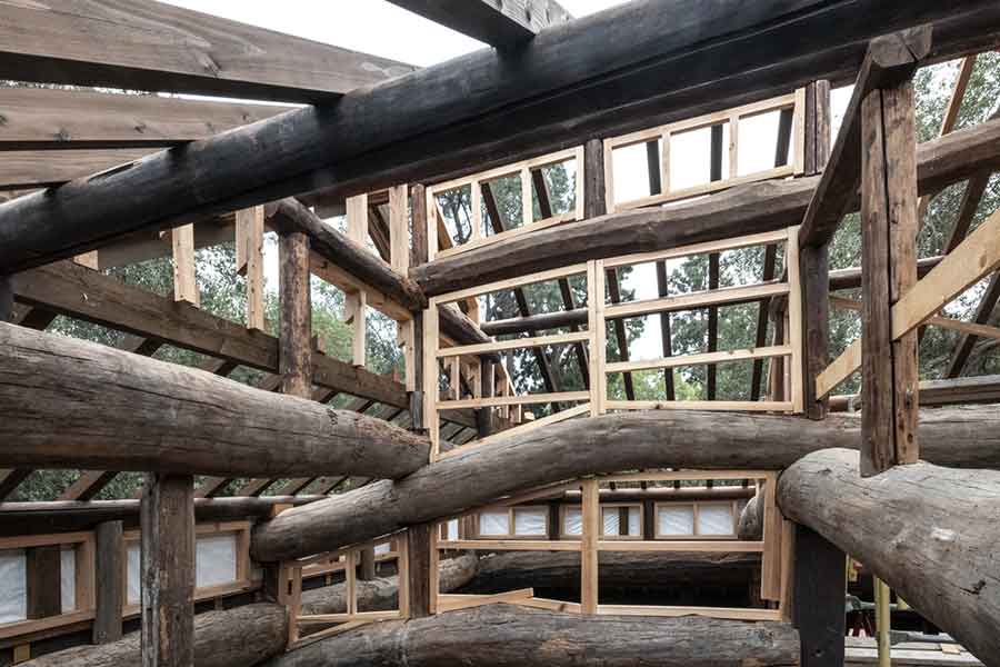 The house is being rebuilt with the original materials using traditional Japanese post-and-beam construction. The Huntington Library, Art Museum, and Botanical Gardens. Photo by John Diefenbach.