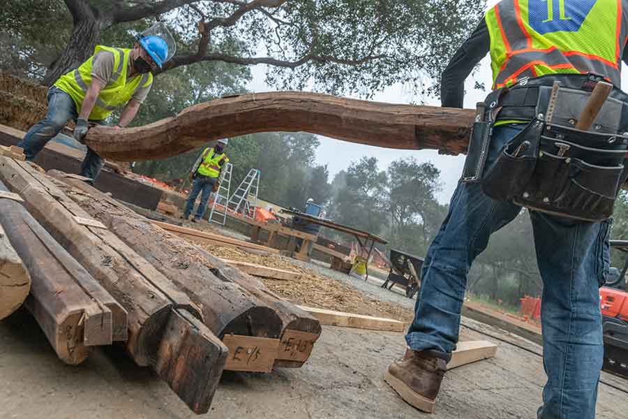 Artisans from Japan have joined the construction team, working alongside the American contractors. Pictured here, two wood craftsmen move one of the original notched roof beams in preparation for installation. The Huntington Library, Art Museum, and Botanical Gardens. Photo by John Diefenbach.