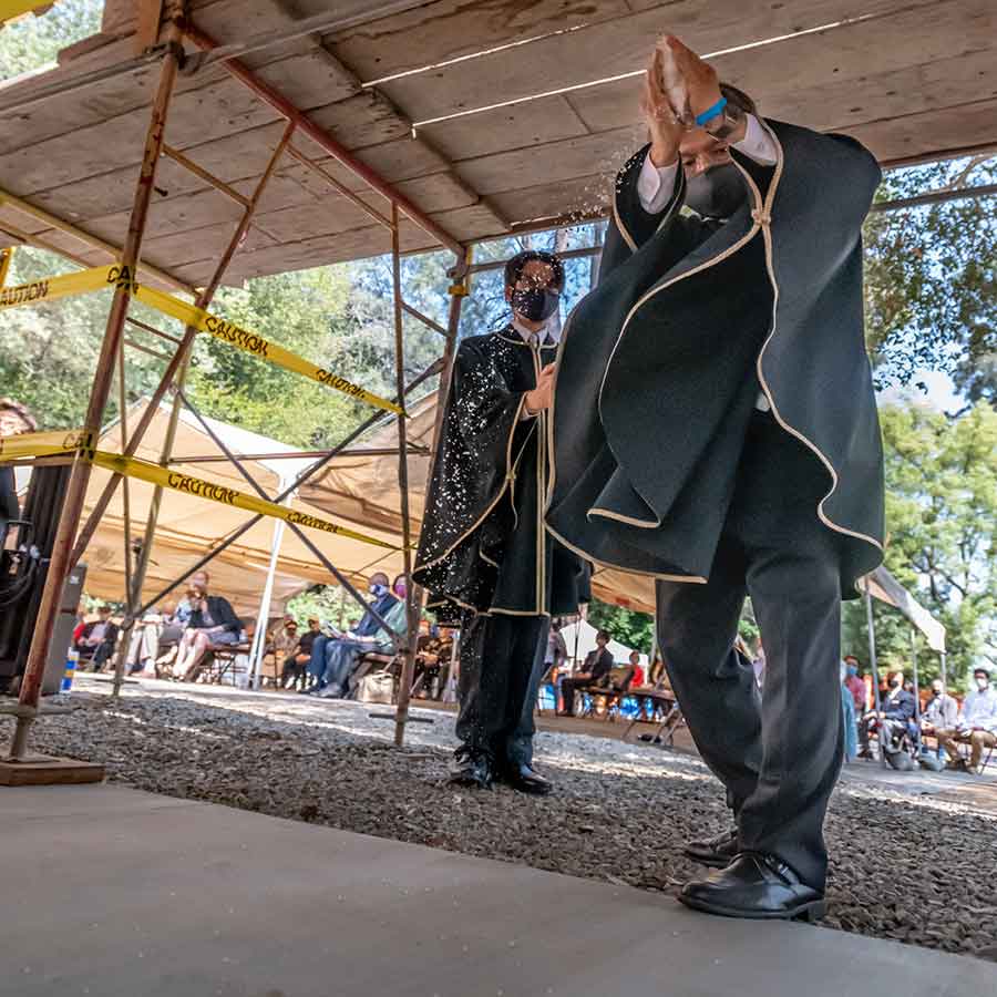 Offerings of fruit, rice cakes, fish, and wine; humble gifts of pine sprigs; scatterings of salt; rhythmic chants; and a taiko drum’s deep resonant tones soaring skyward to invoke the spirits. These were some of the sights and sounds of the jotoshiki, a Shinto roof-raising ceremony held at The Huntington on May 19. The purpose of the ceremony was to bless the reconstruction of a 320-year-old house from Marugame, Japan, that was donated to The Huntington in 2016 by Yohko and Akira Yokoi and is being rebuilt in the Japanese Garden. A jotoshiki is typically held when the basic framework of a structure has been constructed and the ridgepole of the roof is raised. (A similar ceremony was held in Japan in 2019, before the house was disassembled in preparation for its relocation to The Huntington.)