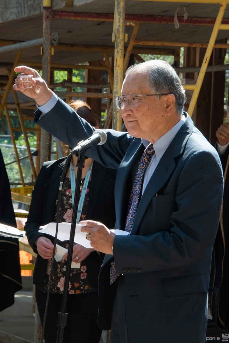 Akira Yokoi, the 19th generation descendent of the Yokoi family and the donor of the Magistrate’s House—his family’s ancestral home—lifts a glass of sake as a toast to the success of the reconstruction project. The Huntington Library, Art Museum, and Botanical Gardens. Photo by John Diefenbach.