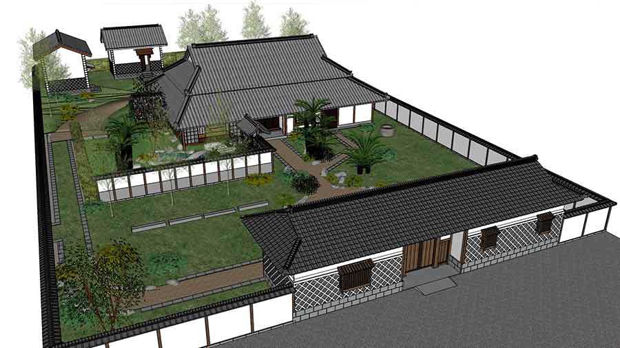 Artist’s rendering of the reconstruction, with the original shoya residence in the center, two kura storehouses at the rear, and re-creations of the gatehouse and interior garden. The anticipated public opening date is Fall 2022. Image courtesy of GPM Design Studio.