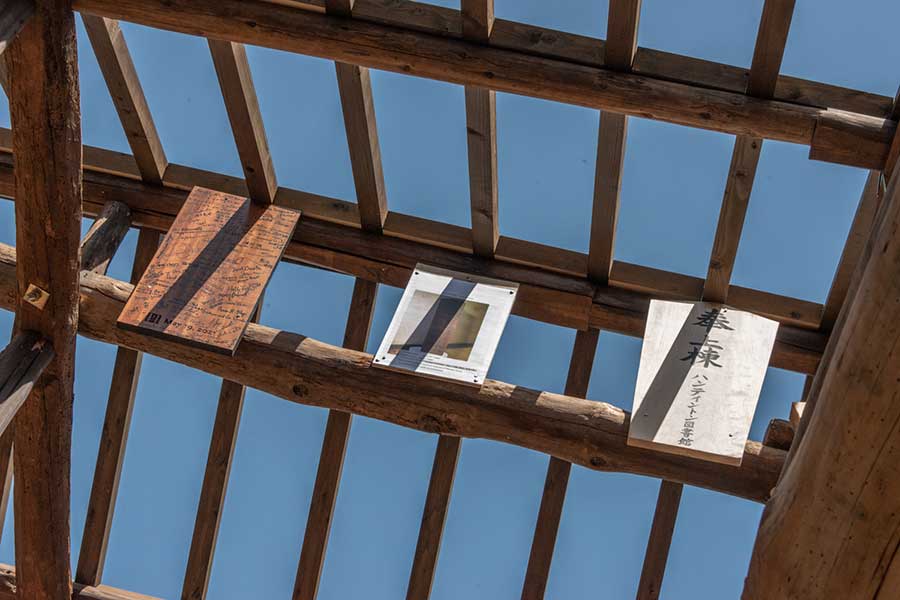 Yokoi then invited those in attendance to write their names on a wooden plaque that would be affixed to the rafters of the house—a time-honored tradition in Japan that has been passed down through the centuries. The plaque was subsequently installed at the highest point in the roof; next to it was hung a photo of an age-worn plaque dating from the house’s construction in 1695, inscribed with the original builders’ names.