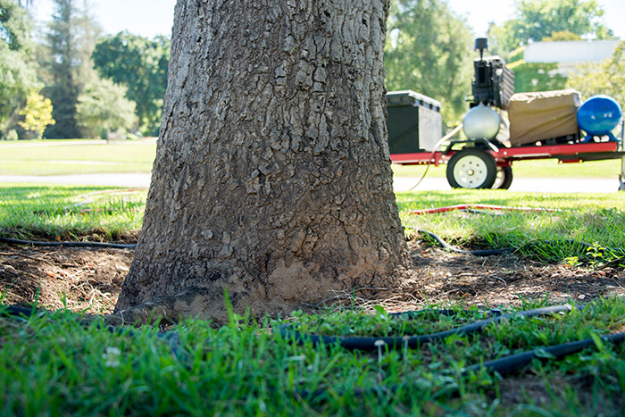 Over time, soil accumulates around a tree’s trunk, cutting off the air supply. Help is on the way, in the form of an air spade attached to an air compressor, seen here in the background. Photo by Kate Lain.