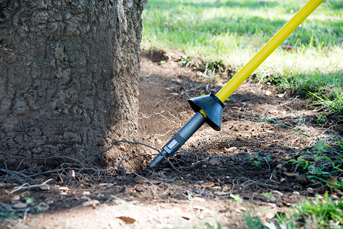 Attached to a compressor, the spade shoots 110 pounds per square inch of air through a metal tube and nozzle. The blast of air is just powerful enough to dislodge soil without damaging delicate roots.