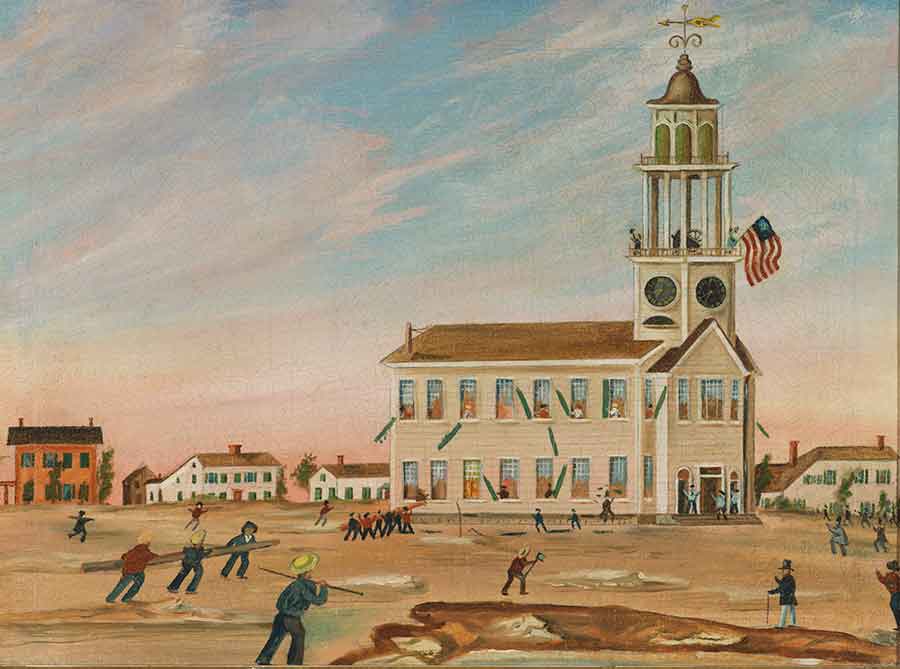Before the Burning of the Old South Church in Bath, Maine by John Hilling, ca. 1854, oil on canvas, 21 3/4 x 27 7/8 x 2 1/8 in. (55.2 x 70.8 x 5.4 cm.). Jonathan and Karin Fielding Collection. The Huntington Library, Art Museum, and Botanical Gardens.