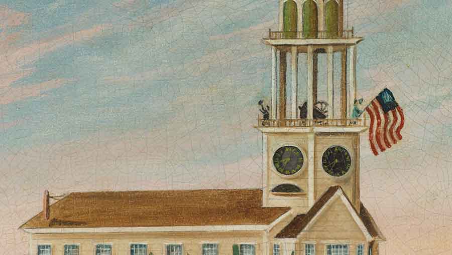 Before the match is struck, a man has climbed to the belfry to unfurl an American flag. The clock on the church’s tower tells the time: 7:40 in the evening. Detail from Before the Burning of the Old South Church in Bath, Maine by John Hilling, ca. 1854, oil on canvas, 21 3/4 x 27 7/8 x 2 1/8 in. (55.2 x 70.8 x 5.4 cm.). Jonathan and Karin Fielding Collection. The Huntington Library, Art Museum, and Botanical Gardens.