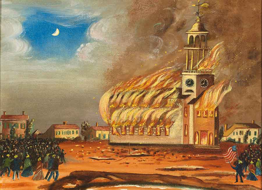 The Burning of the Old South Church in Bath, Maine by John Hilling, ca. 1854, oil on canvas, 21 1/2 x 27 3/8 x 2 1/8 in. (54.6 x 69.5 x 5.4 cm.). Jonathan and Karin Fielding Collection. The Huntington Library, Art Museum, and Botanical Gardens.