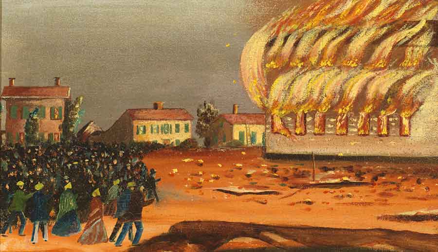 “[T]he shouting and yelling of the multitude, above fifteen hundred in number, could be distinctly heard at a distance of a mile,” the New York Daily Times reported on July 11, 1854. John Hilling, detail of The Burning of the Old South Church in Bath, Maine, ca. 1854, oil on canvas, 21 1/2 x 27 3/8 x 2 1/8 in. (54.6 x 69.5 x 5.4 cm.). Jonathan and Karin Fielding Collection. The Huntington Library, Art Museum, and Botanical Gardens.