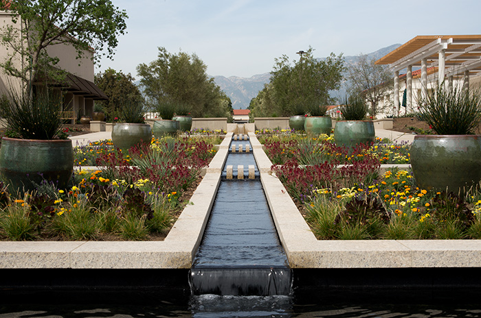 At the end of the olive-lined allée, the garden transitions to the historic core of The Huntington property. Where stairs once led down towards the Library to the right and the Desert Garden to the left, a Celebration Garden now greets visitors with a gentle slope lined with terraced flowered beds and a shallow stream of recirculated water that empties into a rectangular pool.