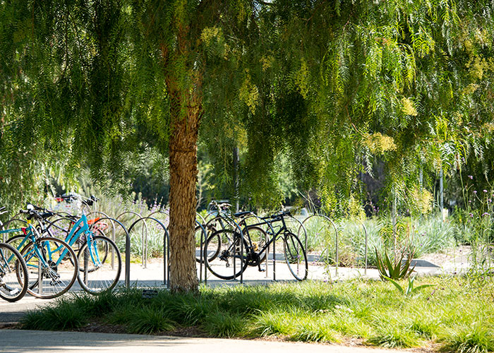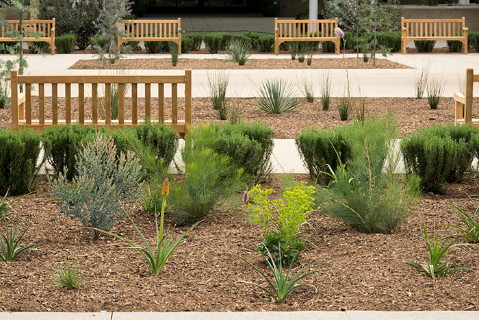 Visitors now arrive from the parking lot under soft, dappled shade provided by more than a dozen large California pepper trees (Schinus molle) and then enter a courtyard seating area sheltered by four stately podocarpus trees (mature Podocarpus gracilior, relocated from elsewhere on the property). A long allée of fruitless olives (Olea europea ‘Wilsonii’) leads to the Education and Visitor Center’s formal entrance.