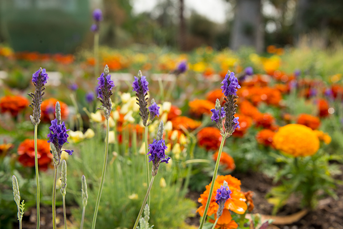 Throughout the Celebration Garden, flowers bloom in a riot of colors. You’ll find the intense blues of Canary Island lavender (Lavandula canariensis) and Otto Quast Spanish lavender (Lavandula stoechas ‘Otto Quast’), as well as a rainbow of yarrow, penstemon, kangaroo paw, aeonium, and California poppy. Meanwhile, cheerful, elegant Lemon Queen lavender cotton (Santolina neapolitana ‘Lemon Queen’) demonstrates how at home a Mediterranean native plant can be in California.