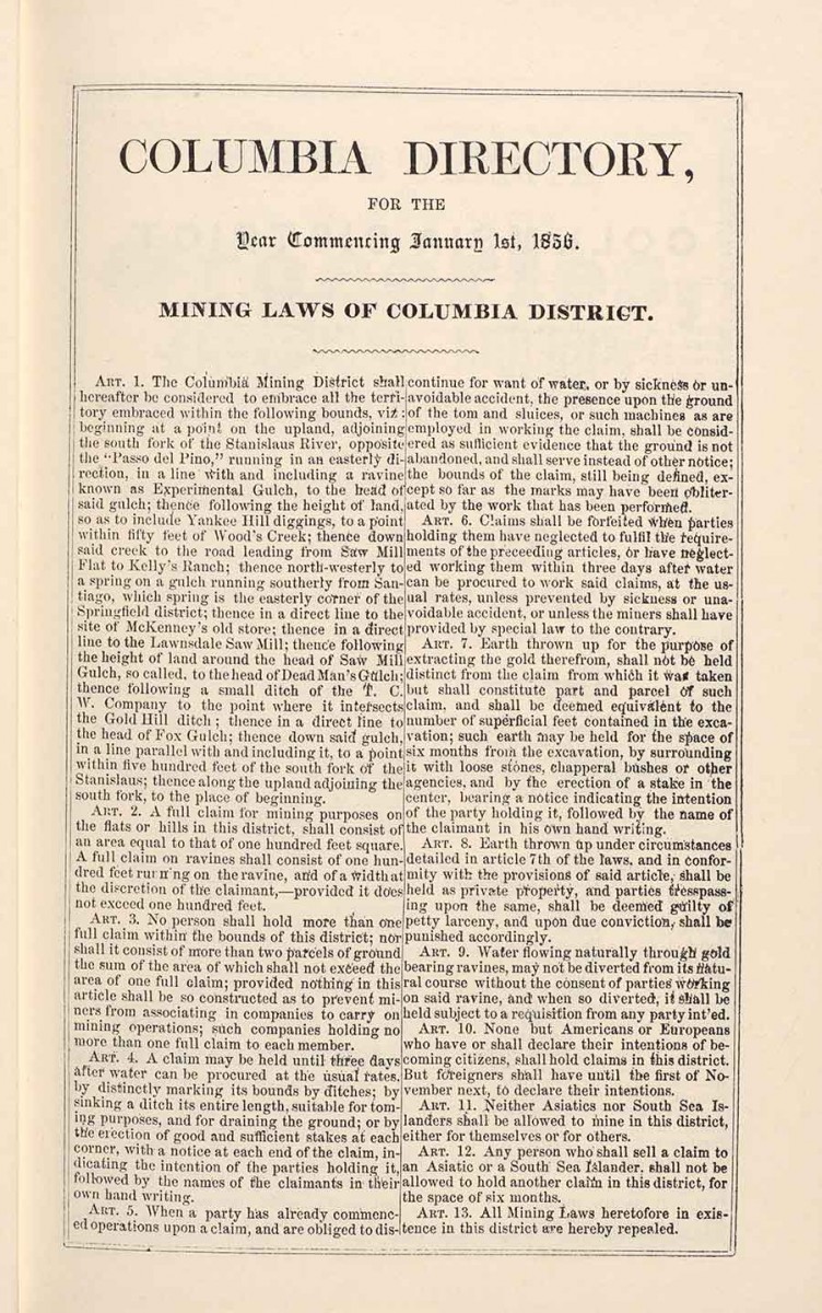 “Columbia Directory with Mining Laws of Columbia District,” from the Miners and Business Men’s Directory, originally published in Columbia, California, by Heckendorn & Wilson, 1856.  The Columbia District was the only district out of 30 in Tuolumne County that cited the exclusion of Chinese. For example, Article 11 states: “Neither Asiatics nor South Sea Islanders shall be allowed to mine in the district, either for themselves or for others.” The Huntington Library, Art Museum, and Botanical Gardens.