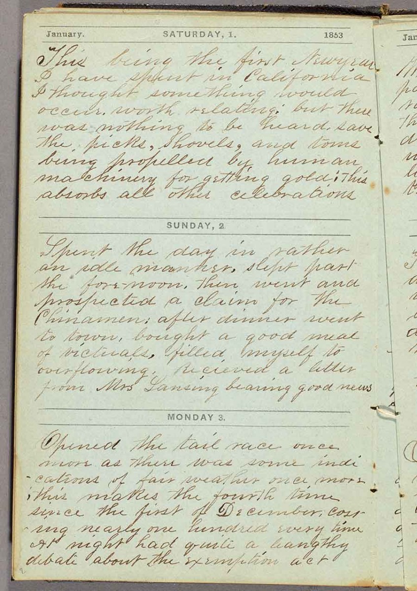 The diary of the gold miner H. B. Lansing, 1853. On Jan. 2, Lansing wrote: “Spent the day in rather an idle manner, slept past the forenoon, then went and prospected a claim for the Chinamen.” The Huntington Library, Art Museum, and Botanical Gardens.