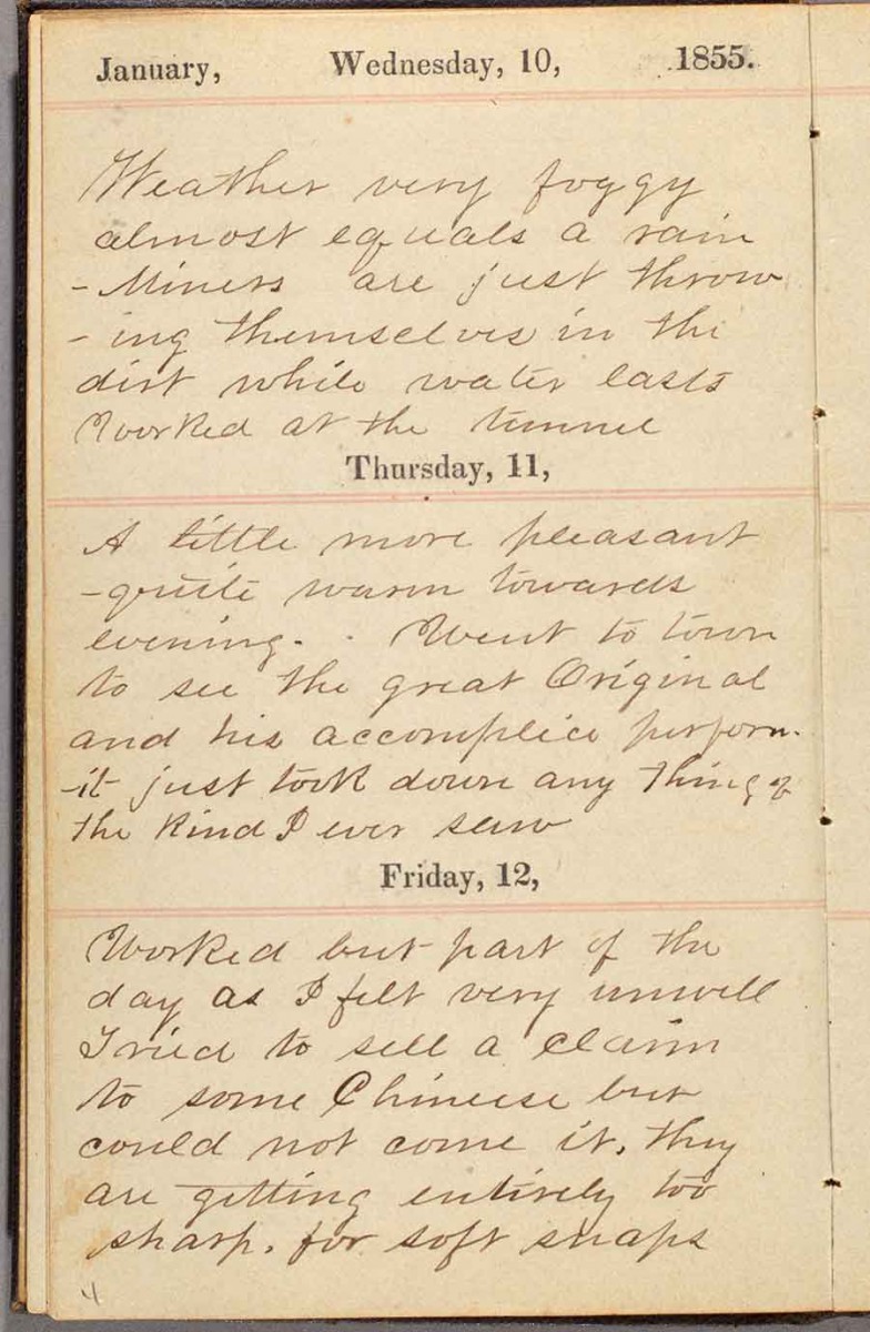 The diary of the gold miner H. B. Lansing, 1853. On Jan. 12, Lansing wrote: “Worked but part of the day as I felt very unwell. Tried to sell a claim to some Chinese but could not come it. They are getting entirely too sharp . . .” The Huntington Library, Art Museum, and Botanical Gardens.
