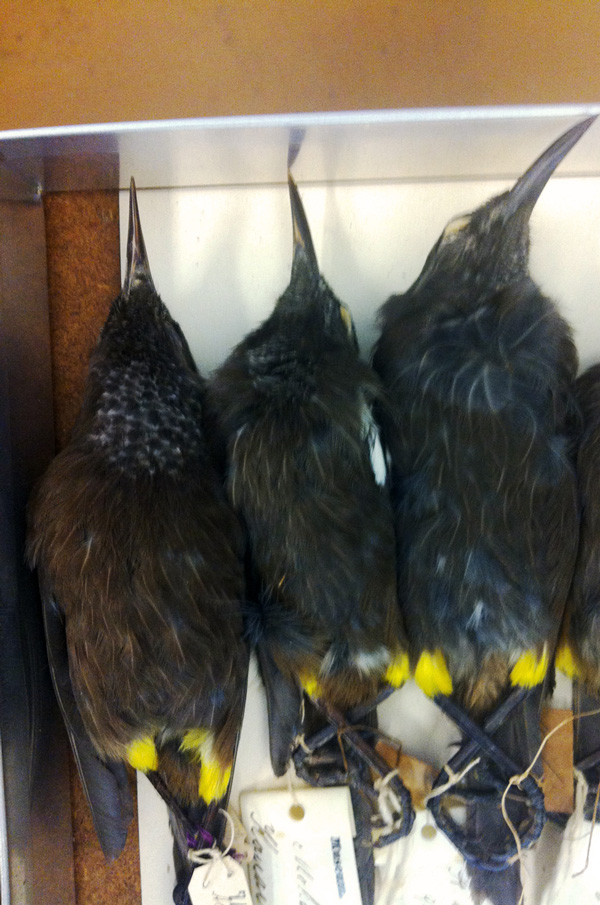 Kaua'i O'o (Moho braccatus), now extinct, and other Hawaiian songbirds, at the department of ornithology, American Museum of Natural History. Photo by Daniel Lewis.
