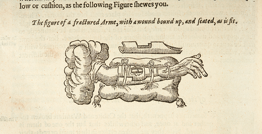 Bone fractures were a difficult and important surgical problem, one Paré treated in his writings. This detail from the 1634 English edition of Paré’s collected writings illustrates a passage on fractures in the bones of the forearm accompanied with wounds. He writes that they should be set and held steady, supported with “plates of Latin, or Past-bord” and rested “upon a soft pillow or cushion,” in the manner depicted. The Huntington Library, Art Collections, and Botanical Gardens.