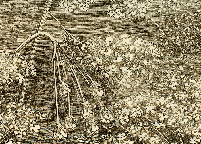 Let me pause here to give a brief history of the miniature fairy. The idea of miniature fairies is a relatively new one. In folklore and superstition, fairies are typically described as child-sized, perhaps three feet in height. Most scholars agree that Shakespeare was the first to imagine miniature fairies in Mercutio’s Queen Mab speech in Romeo and Juliet (1597). In 1798, the artist Thomas Stothard depicted fairies with butterfly wings for the first time in his illustrations for Alexander Pope’s The Rape of the Lock. Popular tradition says that a friend had suggested to Stothard that he paint Pope’s sylphs with butterfly wings. Stothard supposedly replied, “That I will, and to be correct, I will paint the wing from the butterfly itself.” Then, he ran out into his garden.