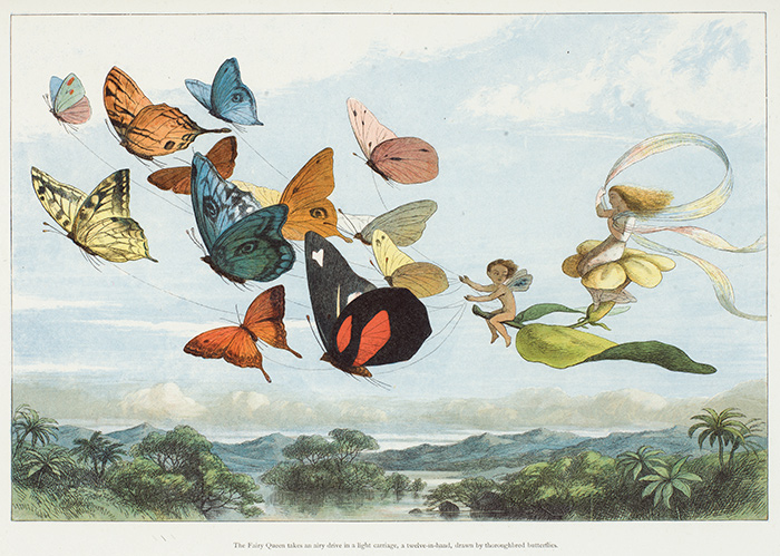 Richard Doyle, illustration of “The Fairy Queen Takes an Airy Drive in a Light Carriage, a Twelve-in-hand, drawn by Thoroughbred Butterflies” from In Fairy Land: A series of pictures from the elf-world by William Allingham (1870). The Huntington Library, Art Collections and Botanical Gardens.