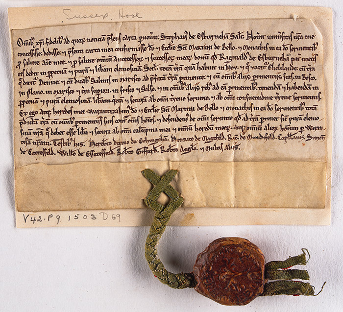 “Confirmation of Grant in Free Alms,” granting the abbot and convent of Battle control of certain lands, circa 1200. Battle Abbey Collection, BA 42/1503. The Huntington Library, Art Collections, and Botanical Gardens.