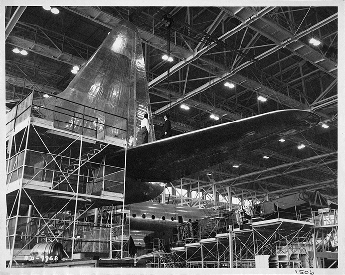Lockheed R6V Constitution Aircraft under construction. Harvey Christen Collection, The Huntington Library, Art Collections, and Botanical Gardens. Harvey Christen (1910–1993), a mechanic, was one of the first employees of Lockheed Aircraft Corporation.