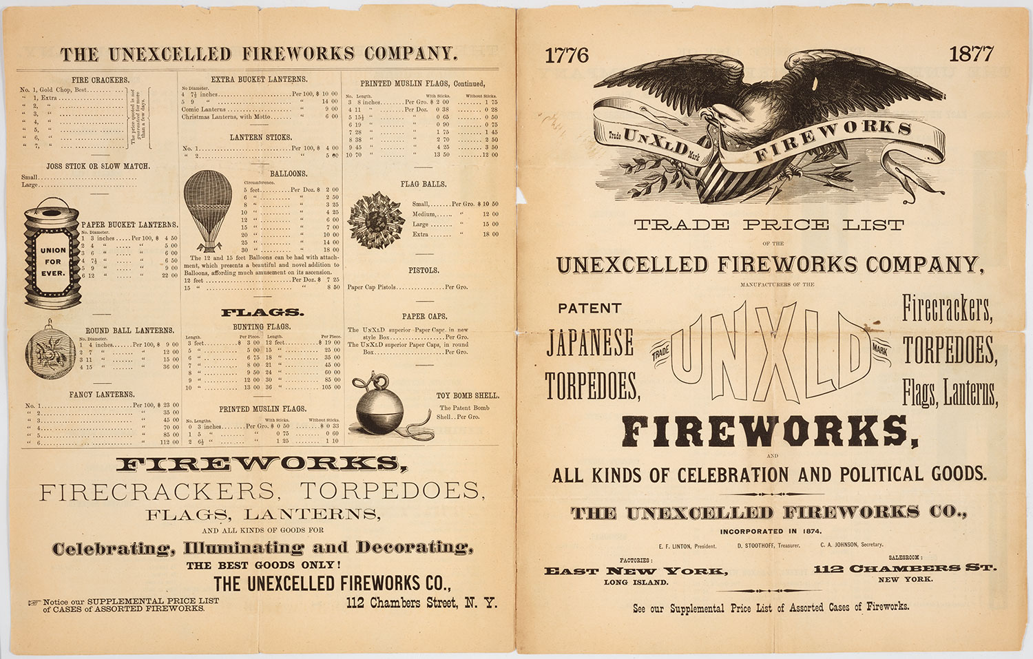 Price list for Unexcelled Fireworks Company, 1877. (Click the image above to see a larger version of it.) Jay T. Last Collection of Graphic Arts and Social History. The Huntington Library, Art Collections, and Botanical Gardens.