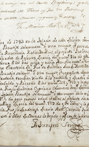 Baptismal register from Mission San Carlos, signed by Father Junipero Serra, 1783. The Huntington Library, Art Collections, and Botanical gardens.