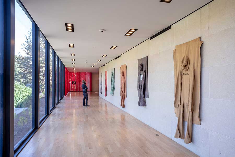 Some of the works presented in the exhibition seek to connect with The Huntington’s collections in direct, inventive ways. In the entrance to the Virginia Steele Scott Galleries of American Art, for example, the visitor encounters the experimental art of the late Nicola L. Her Pénétrables, six canvases shaped as human bodies, dyed in natural hues, are meant to be worn by performers. Representing natural elements, the canvases face outward, toward the botanical gardens at The Huntington, suggesting a dialogue with nature that can be mediated by the human body.