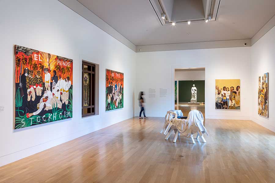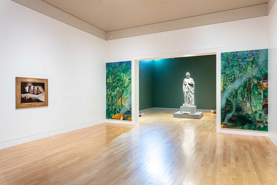 Patrick Jackson’s Heads, Hands, and Feet features human-modeled figures, like the ones whose feet are visible here, that lie supine on the floor near Harriet Goodhue Hosmer’s monumental sculpture, Zenobia in Chains. Jill Mulleady’s Interior of a Forest (diptych) frames Zenobia with a burning trail in a wooded scene. On the wall to the left is The Three Witches, Mulleady’s replica of Henry Fuseli’s painting of the same title in the Huntington Art Gallery; in her version, Mulleady has replaced the face of Fuseli’s leftmost witch with a self-portrait. Patrick Jackson, Head, Hands and Feet, 2011, resin, silicone, human hair, yak hair, denim clothing, 72 × 28 × 9 in. (182.9 × 71.1 × 22.9 cm). Courtesy of the artist and François Ghebaly, Los Angeles. Jill Mulleady, Interior of a Forest (diptych), 2020, oil on linen, 112 × 51 3/16 in. (284.5 × 130 cm). Courtesy of the artist. Jill Mulleady, The Three Witches, 2020, oil on linen, 36 1/4 × 40 15/16 in. (92 × 104 cm). Courtesy of the artist. Photo by Joshua White.