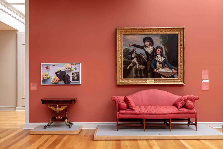 Buck Ellison’s photograph Untitled (Cufflinks), left, appears alongside John Singleton Copley’s The Western Brothers in The Huntington’s Virginia Steele Scott Galleries of American Art. Buck Ellison, Untitled (Cufflinks), 2020, archival pigment print, 21 7/8 × 41 in. (55.6 × 104.1 cm). Courtesy of the artist, Balice Hertling, Paris, and Sunday Painter, London. Photo by Joshua White.