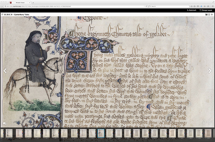The Huntington’s Ellesmere manuscript of Chaucer’s Canterbury Tales, open to the first lines of “The Tale of Melibee,” as seen through the Mirador viewer. Along the bottom of the screen, you can see each image of the individual pages that comprise the volume. This feature makes it easy to scroll through images and zoom in on particular passages or illustrations.