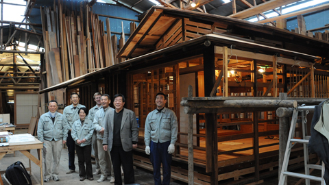 Yoshiaki Nakamura, in black shirt and sports coat, with his team in front of the reassembled house in Kyoto, Japan.