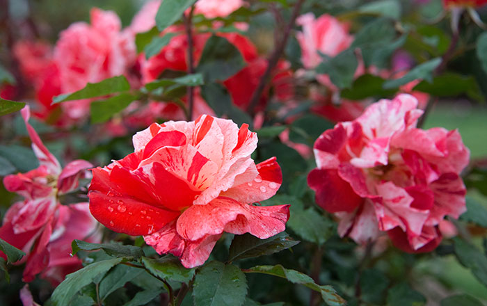 ‘Hanky Panky’, a striped floribunda, attracts attention in bed number 9 of the Rose Garden. Photo by Deborah Miller.