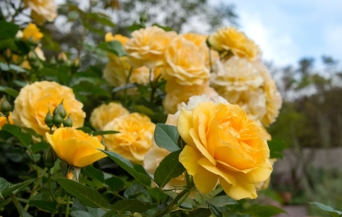 The ‘Julia Child’ rose, a floribunda that’s as golden-yellow as butter and has a sweet licorice fragrance, is named after the famous Pasadena-born chef. Photo by Deborah Miller.