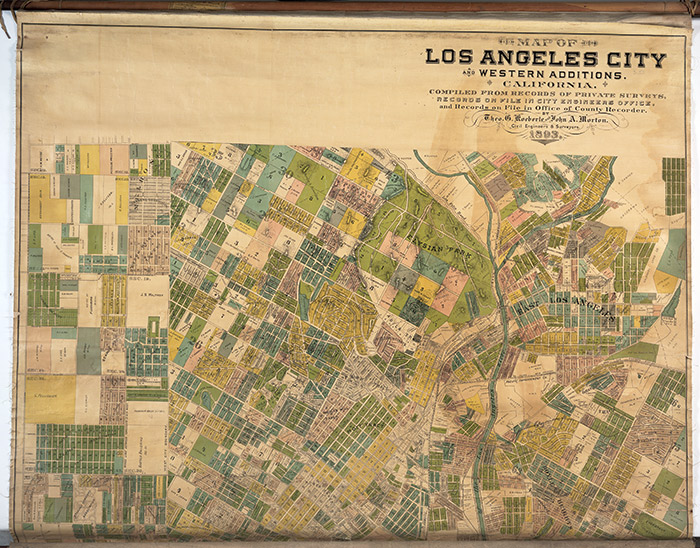 Goldwyn’s book includes this map of Los Angeles, created during the era in which her characters lived. Map of Los Angeles city and western additions compiled from records of . . . Theo. G. Koeberle and John A. Morton, 1893. Los Angeles Lithographic Co. Lithograph, 150 x 150 cm. The Huntington Library, Art Collections, and Botanical Gardens.