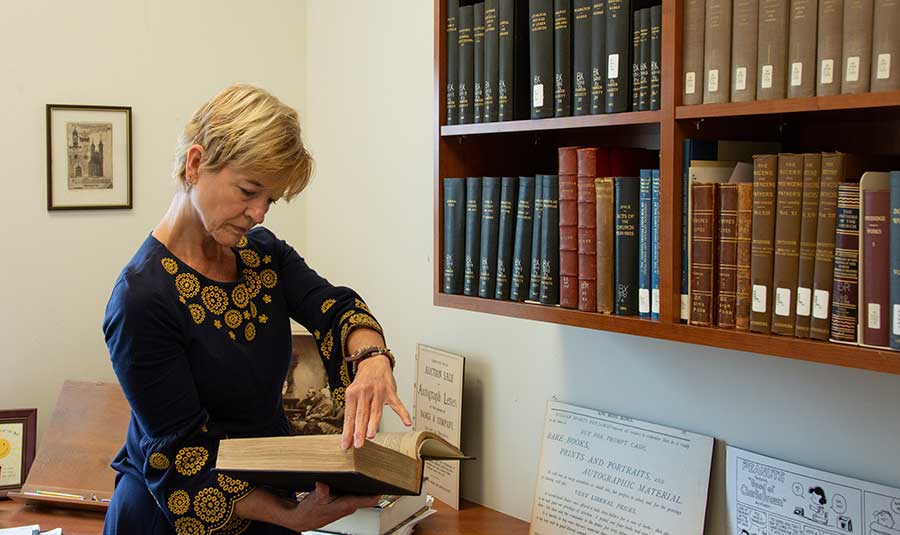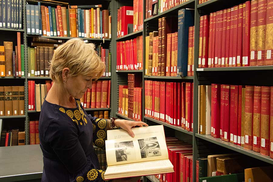 Lori Anne Ferrell, the John D. and Lillian Maguire Distinguished Professor in the Humanities at Claremont Graduate University and a 2018–19 Dana and David Dornsife Fellow at The Huntington, leafs through a volume of Victoria County History. Photo by Deborah Miller.