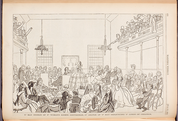 “Ye May Session of Ye Woman’s Rights Convention—Ye Orator of Ye Day Denouncing Ye Lords of Creation,” Harper’s Weekly, June 11, 1859. The Huntington Library, Art Collections, and Botanical Gardens.