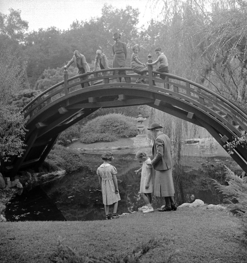 Visitors in the 1930s view the ponds of the Japanese Garden from the moon bridge (the structure was later closed to pedestrians).