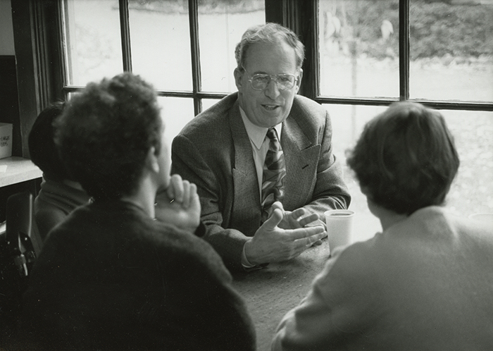 Koblik, in 1995, talking with students at Reed College, where he was president from 1992 to 2001. Photograph courtesy of Special Collections, Eric V. Hauser Memorial Library, Reed College.